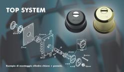 (-) DEFENDER TOP SYSTEM La protezione piu' completa per serratura e cilindro. Il sistema e' composto da un Defender serie 94500 disponibile in quattro altezze abbinato ad una piastra di rinforzo al manganese che aumenta sesibilmente la restenza della serratura ai tentativi di perforazione e strappo. L'entrata della chiave e' protetta da pastiglie rotanti in acciaio rinforzato al manganese per uno spessore totale di 12 mm. |